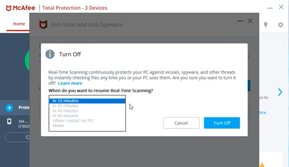 Now here you will see option to set timing to resume “Real-Time Scanning” or permanently disable it until you Turn On manually.