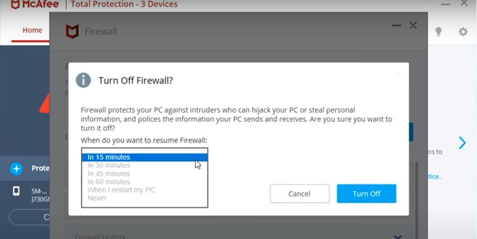 Now here you will again see option to set timing to resume/activate “Firewall” or permanently disable it until you Turn On manually.